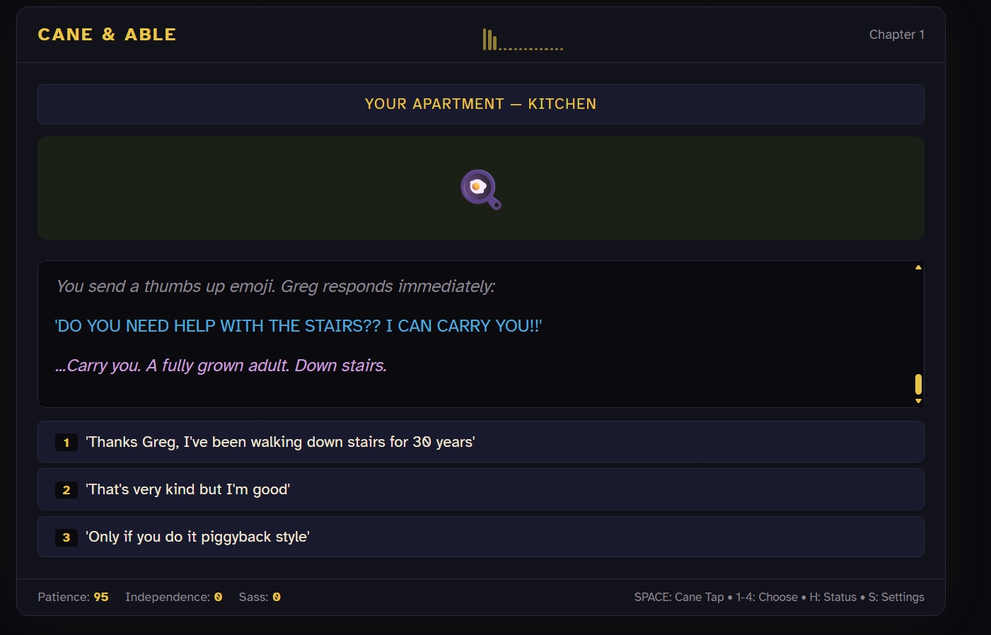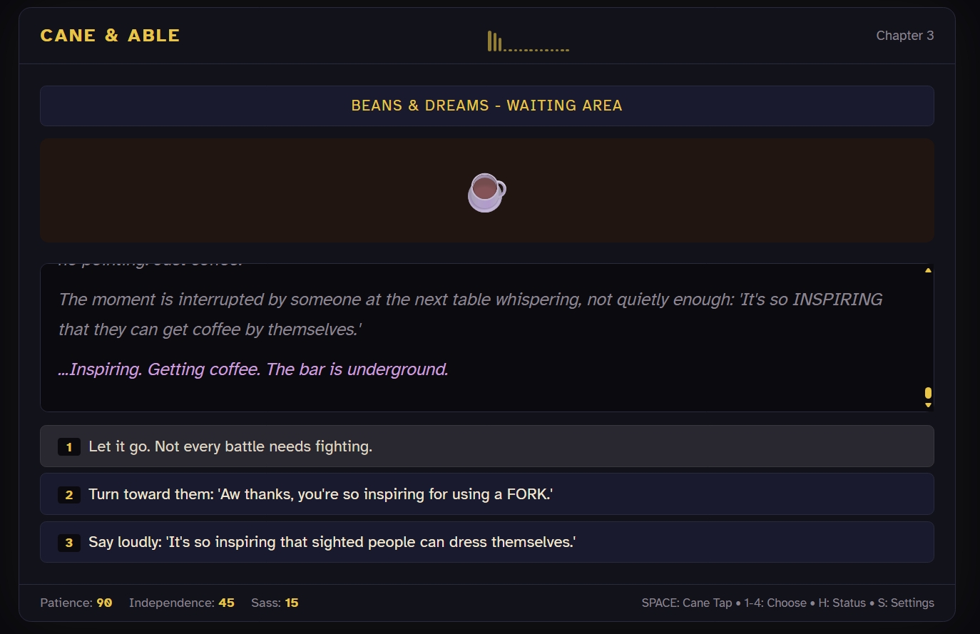 That said, I found this game incredibly frustrating. I'm typically the water off the duck's back type of thinker. But this particular game really got on my nerves for a variety of reasons. I'm a totally blind man, for context, and some of the experiences in this story are ones I've lived personally. Some of the experiences in this story are things I've heard some of my friends complain about. They are frustrating. There are options in this game that navigate them how I typically do. However, the way the dialogue is written, and the protagonist's inner monologue, is incredibly stereotypical and one-dimensional, and makes it feel like they view every person they interact with as lesser than them.