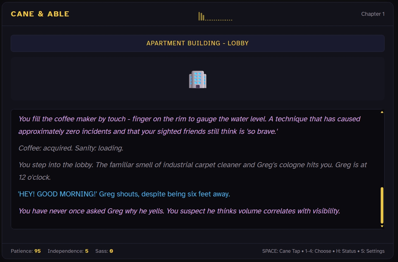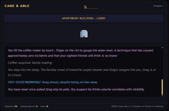 A (hopefully!) 100% Vision-Impaired Accessible game walking through a day for a (fictional) blind protagonist in the city. Disclaimer: the developer is NOT vision-impaired, but I did a lot of reading, and I hope I did an okay job conveying at least a SOMEWHAT partially accurate look into some common experiences.