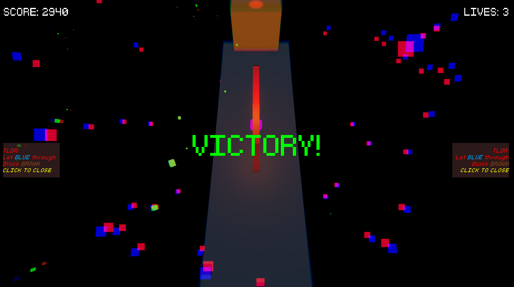 Score as many points as possible by blocking brown boxes and letting blue boxes through. Don't let any solid items reach the furnace, or you'll lose lives. Game over when all 3 lives are lost.