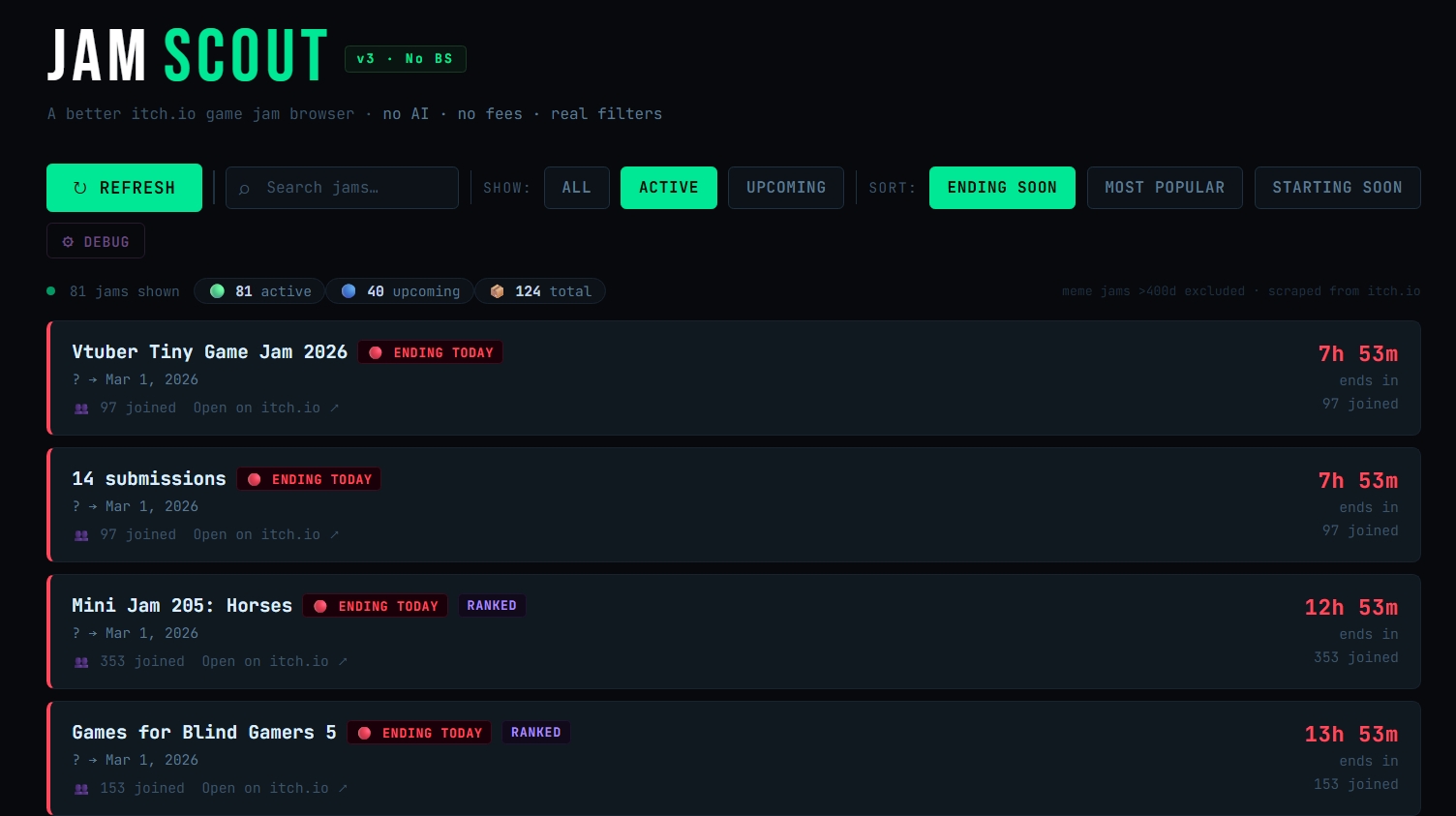 I got tired of always seeing jams that ended days/weeks ago filling the first page of 'ending soonest' or whatnot, so I made this tool for myself. I hope others can find it useful as well :)