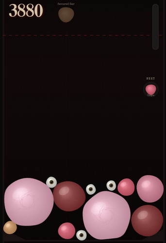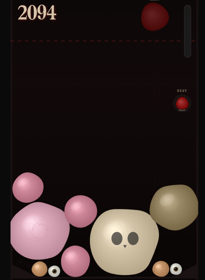 Drop organs from above. Guide them with your cursor. When two of the same kind touch, they merge into the next tier — growing in size, weight, and anatomical complexity. Fill the jar carefully. If the pile rises past the danger line for too long, the madness takes hold. Your screen cracks. Static bleeds in. And then it's over.
